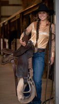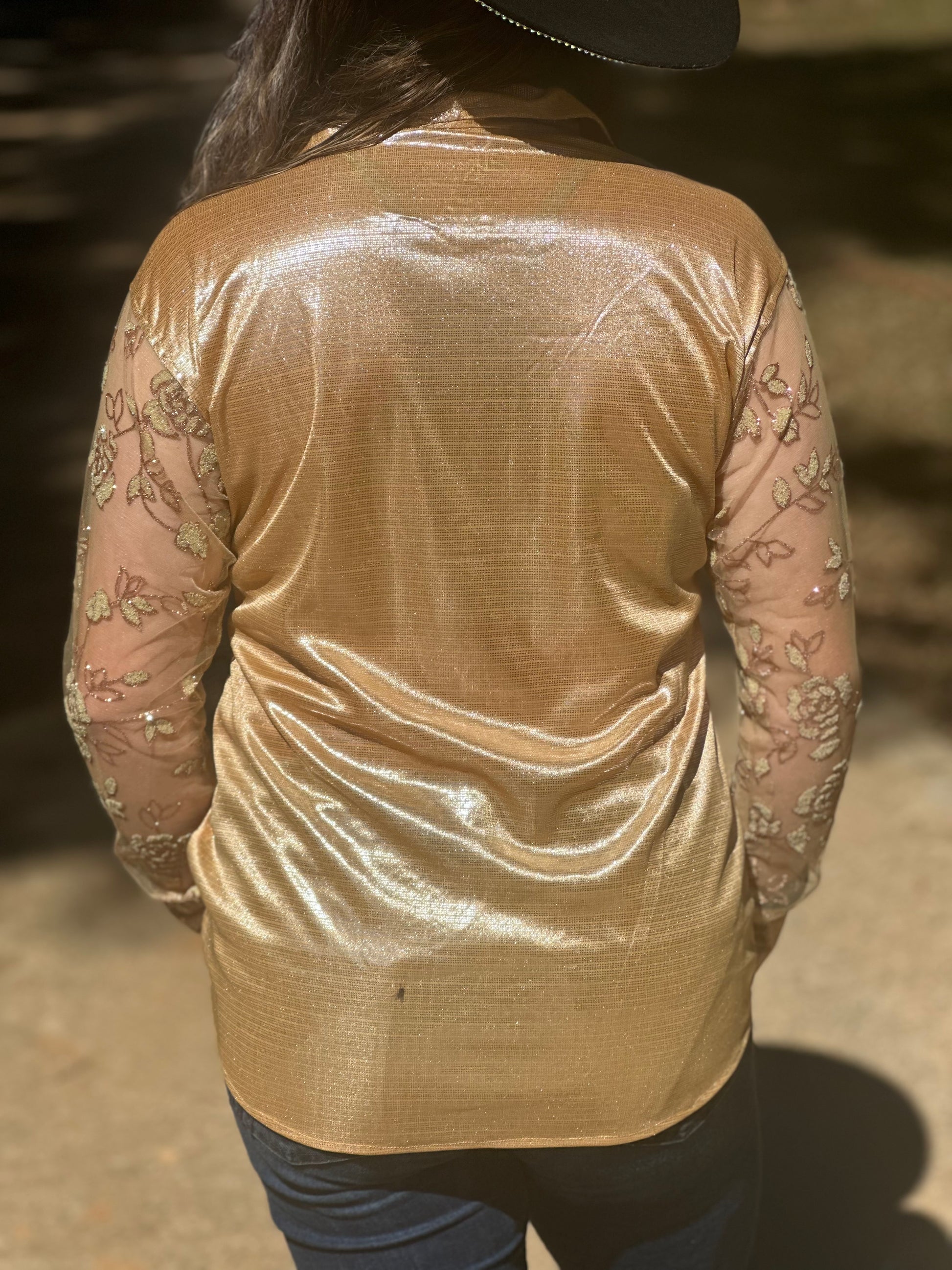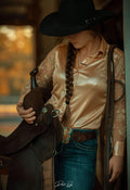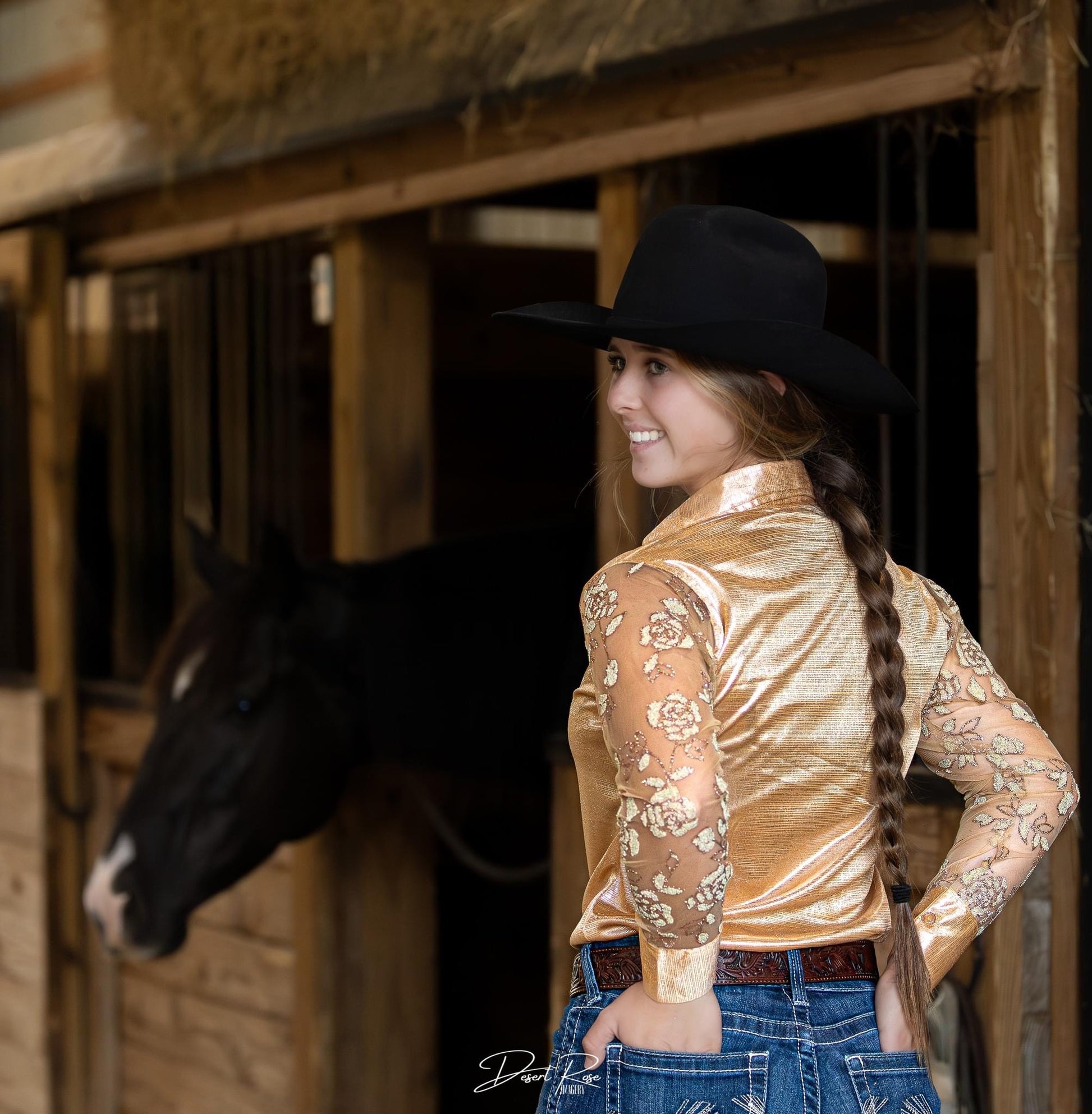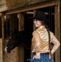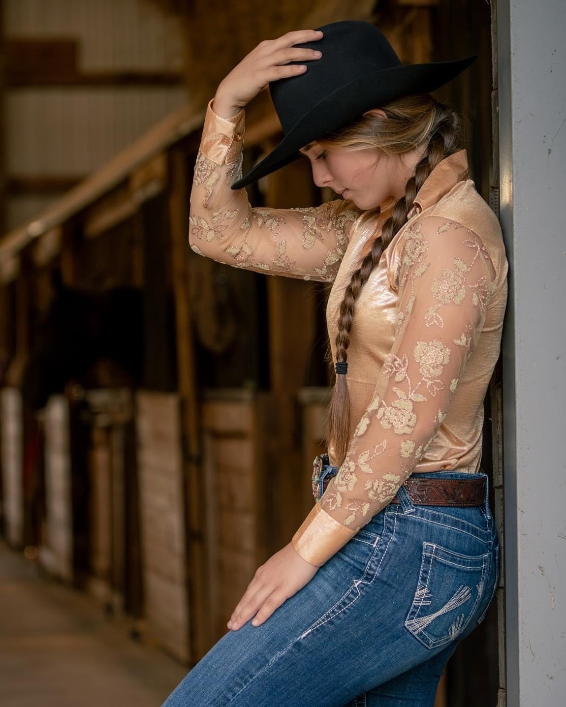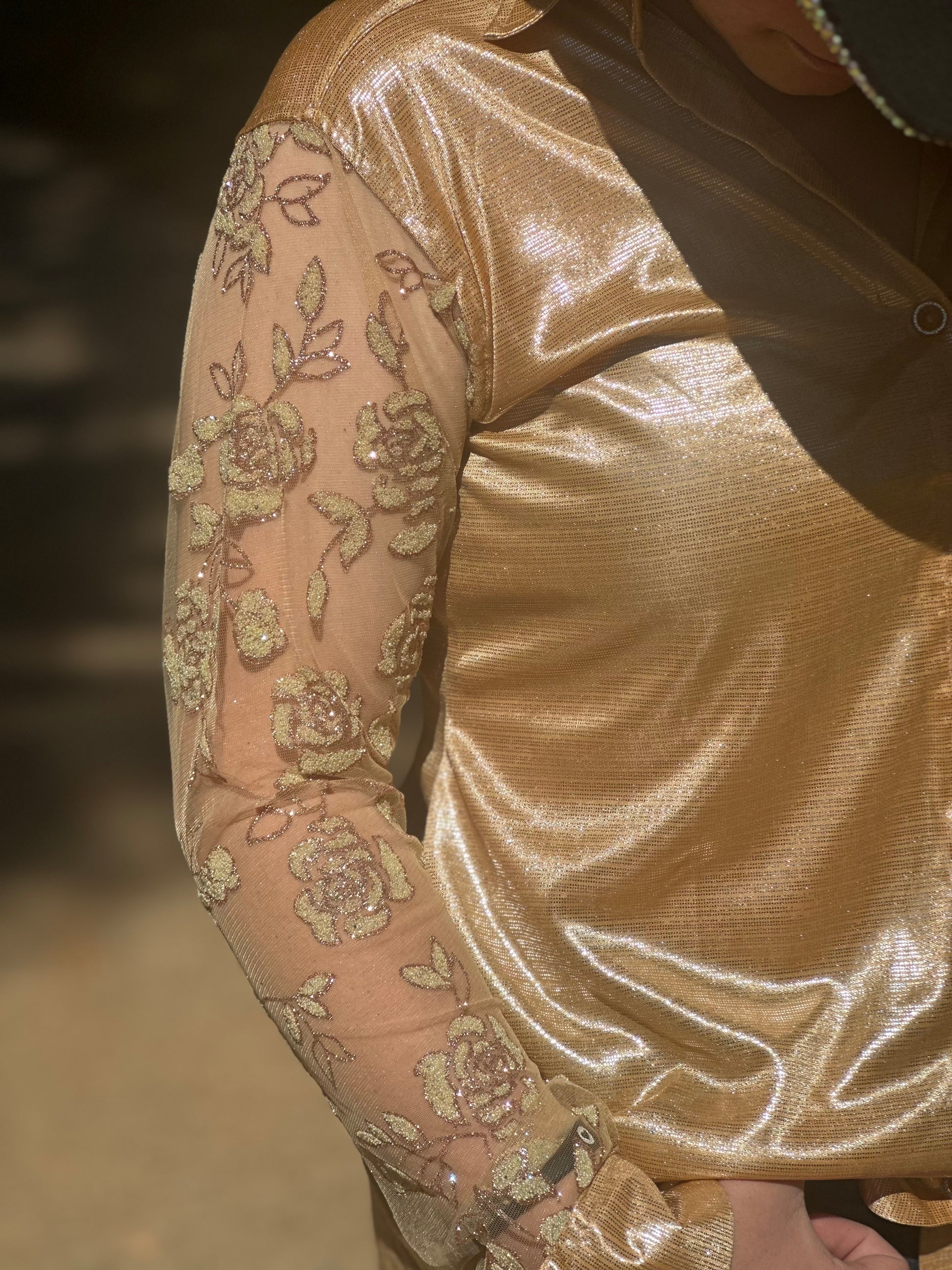 Glow like a champion in The Golden Shine — a Western show shirt designed for elegance and performance. With mesh sleeves for breathability and a flowy, lightweight feel, this shirt keeps you comfortable while delivering maximum shine. The medium stretch ensures the perfect fit, making it a standout choice for any show pen.