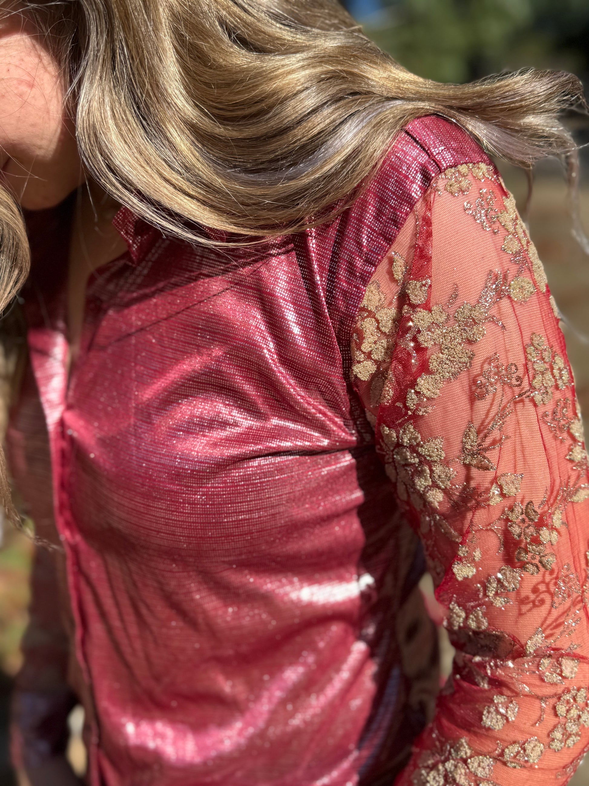 ✨ Sparkly mesh sleeves that shine bright under the lights