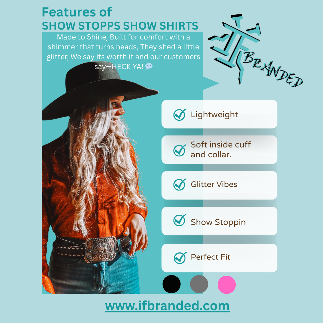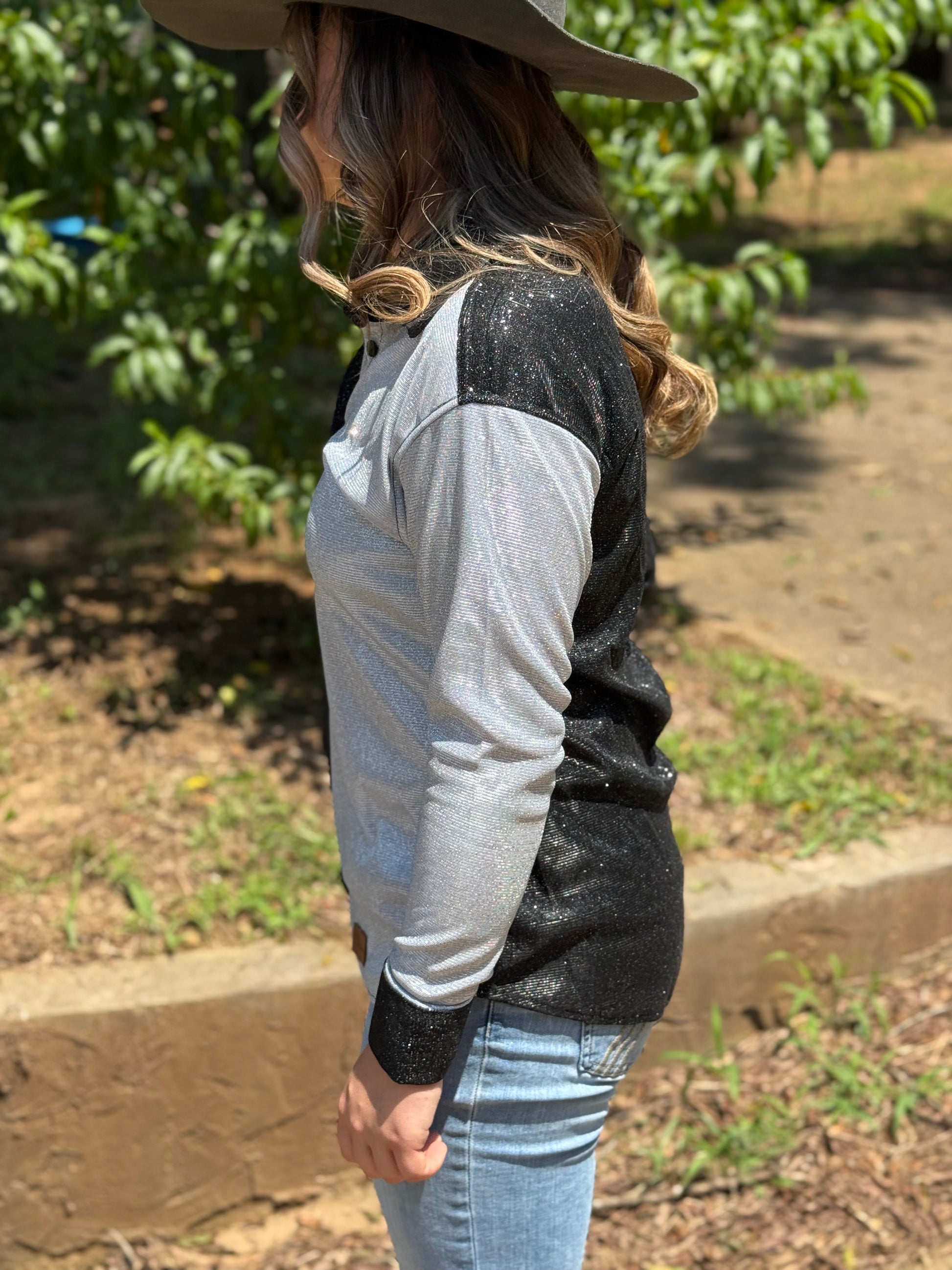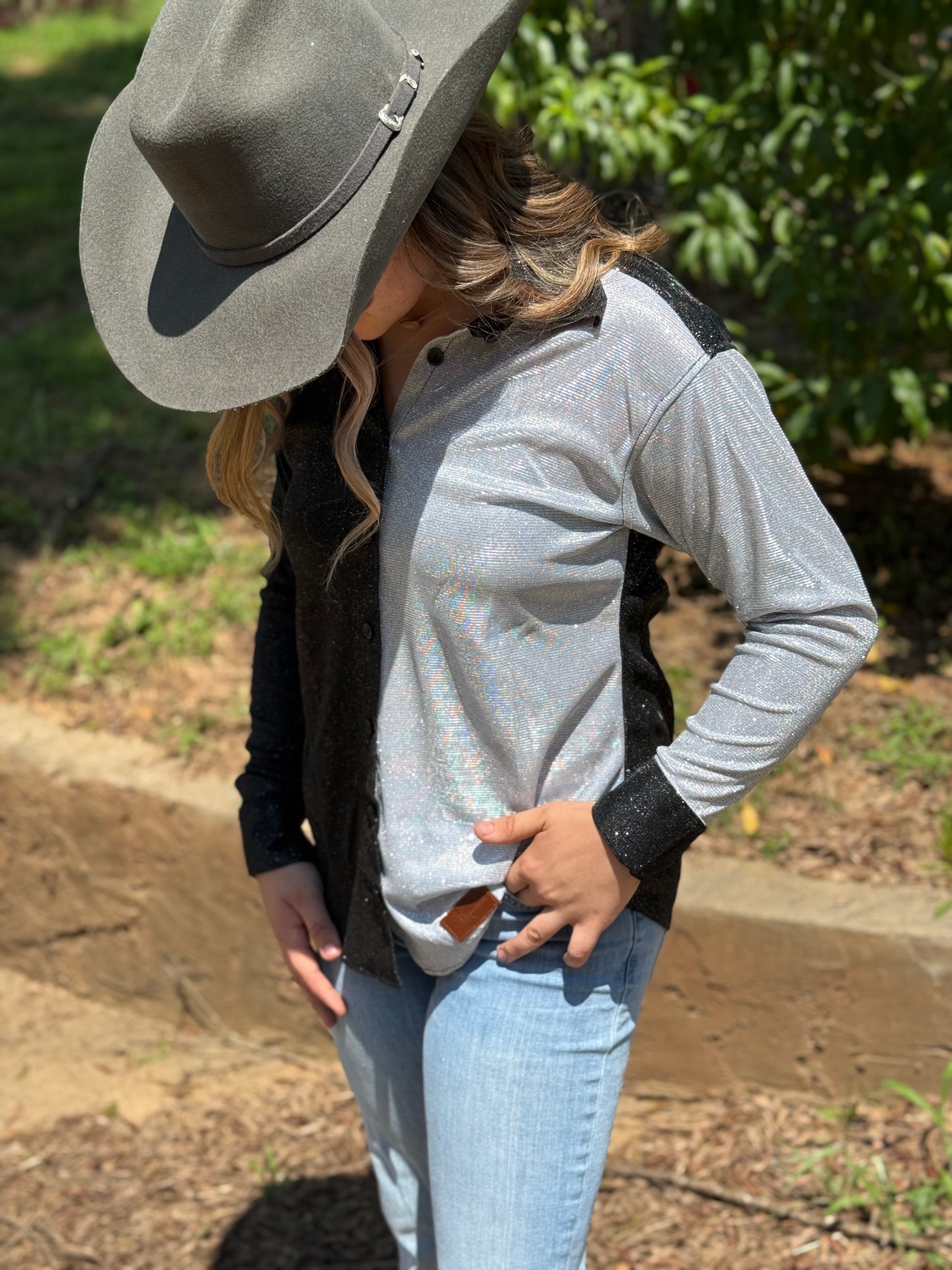 She’s got two sides—and both of them shine. ⚡️ Two-Faced is built with a bold mix of black and silver Show Stopp shimmer fabric, giving you high contrast, high glam, and all the attitude. This shirt doesn't just shimmer—it smolders. Designed for the girl who’s not afraid to be seen. 🤍🖤